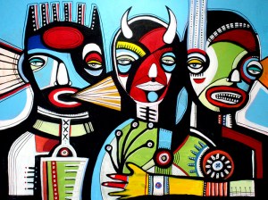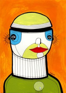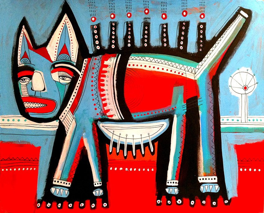 I don’t quite remember how or when, maybe a little over a year ago trolling around on the internet a colorful character catches my eye. I click and click again. I am in a world of pale faced little devils whose cheeks you want to squeeze, animals with colors radiating from their bodies and slack open mouth faces disgruntled blissful? I’m not sure. I’m intrigued, besides the arresting images this guy is selling Art a lot of it. Right there something exploded in my head if this guy can do it I can too. So after sitting on my butt for years I started to work. I went out into my storage and got some Masonite I had scored and started to paint.